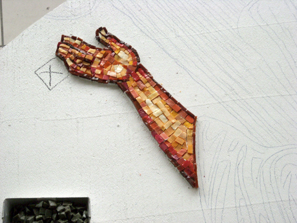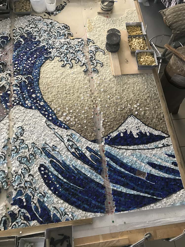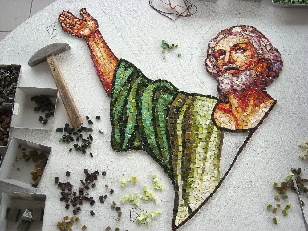 La lavorazione del mosaico è un’arte che ha origini nell’antichità quando con le tessere venivano creati muri e pavimenti. Oggi i mosaici si compongono in laboratorio e sono poi trasportati e fissati nel luogo di destinazione.