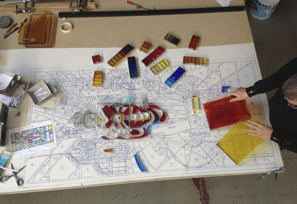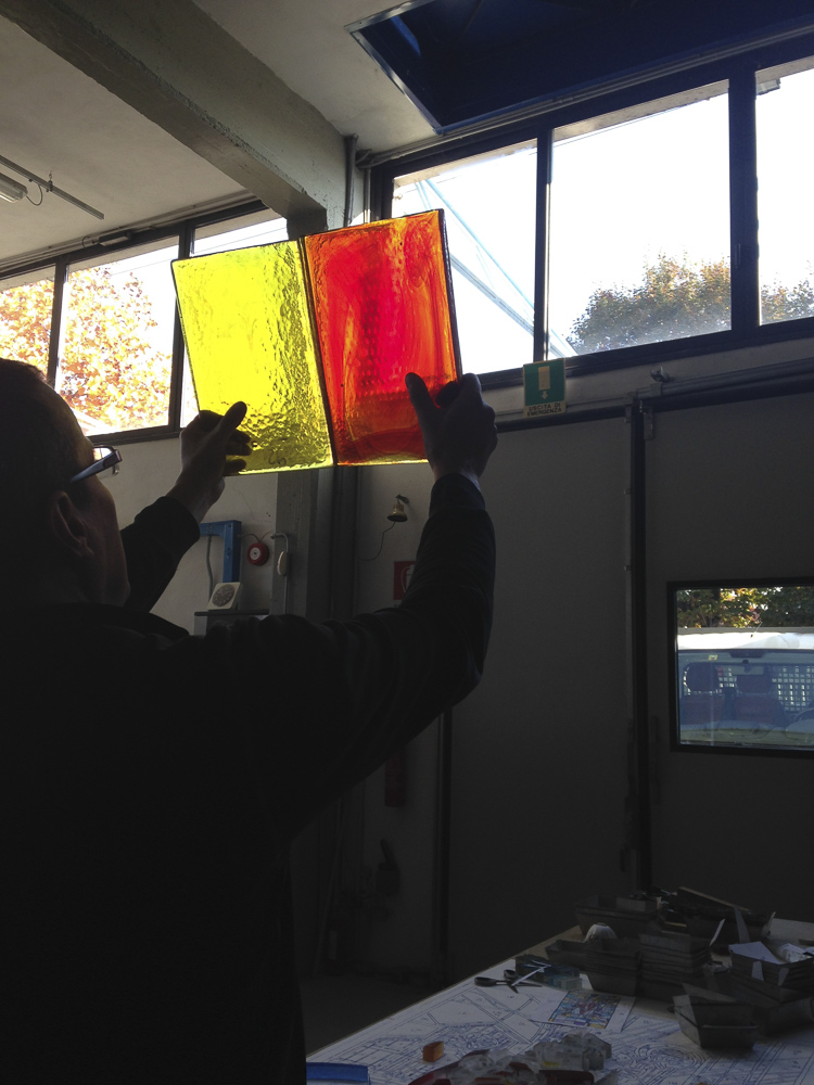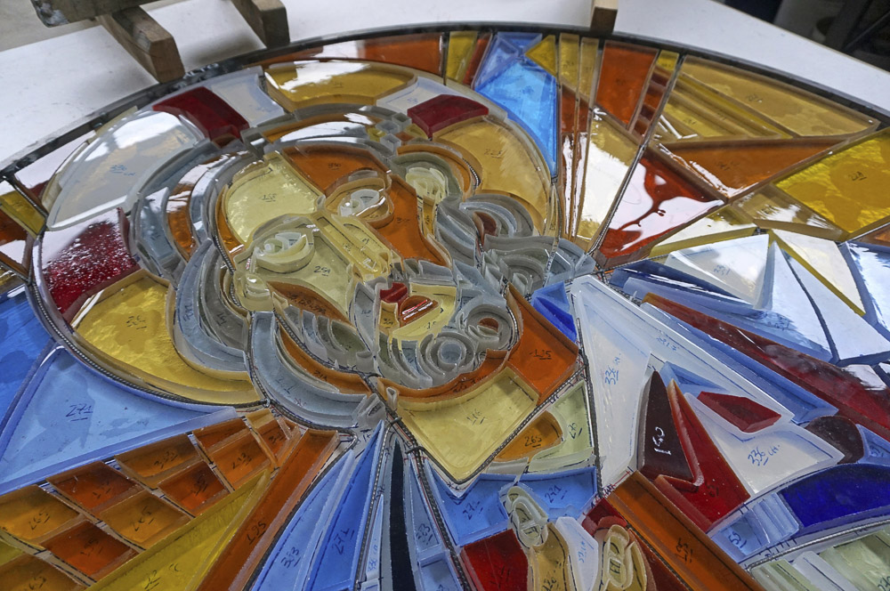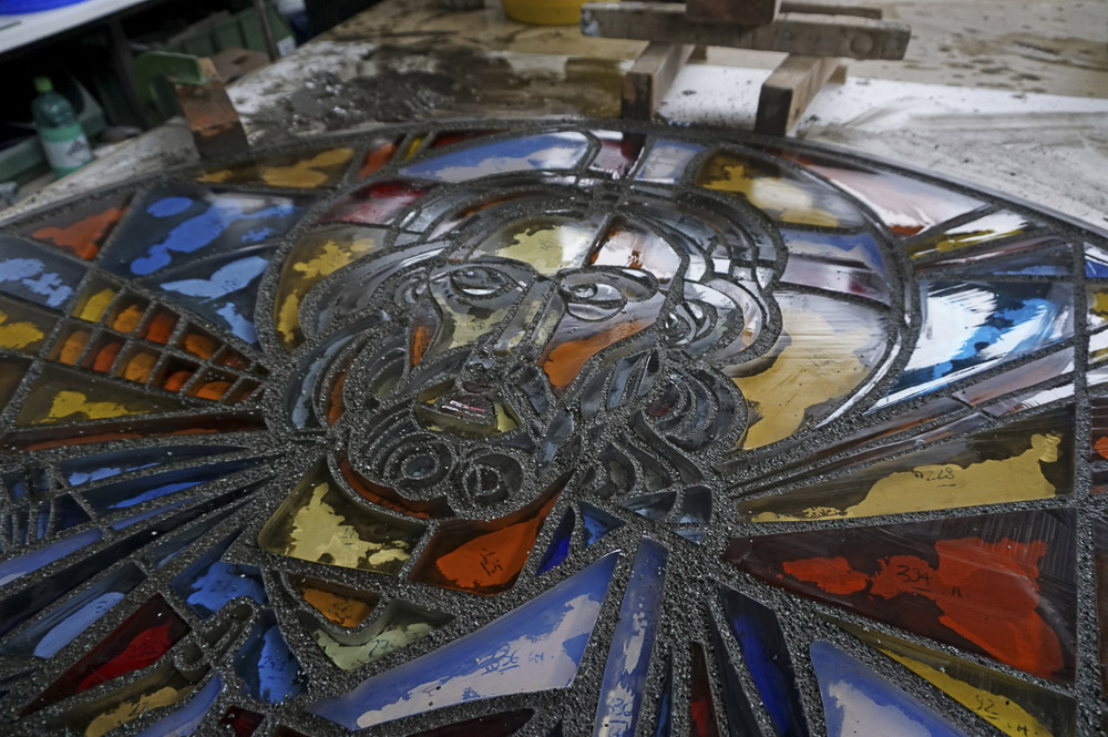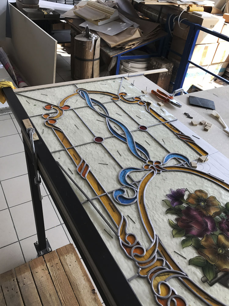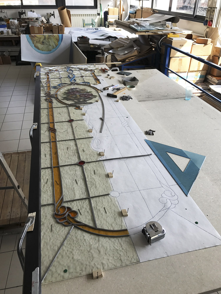 Si comincia dal bozzetto dell’artista, si predispone l’ingrandimento in scala reale, si esegue la scelta cromatica e si tagliano i vetri, quindi si tesse, inserendo i vetri, l’impiombatura. Una volta saldati tutti i piombi ed i vetri tra loro, si passa alla stuccatura. Lo stucco, riempie gli interstizi tra il vetro ed il piombo, impedendo al vetro di muoversi, conferendo rigidità e solidità, nello stesso tempo rendendo la vetrata impermeabile alle intemperie.