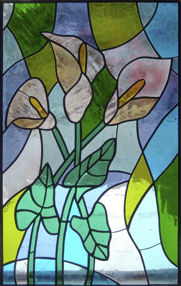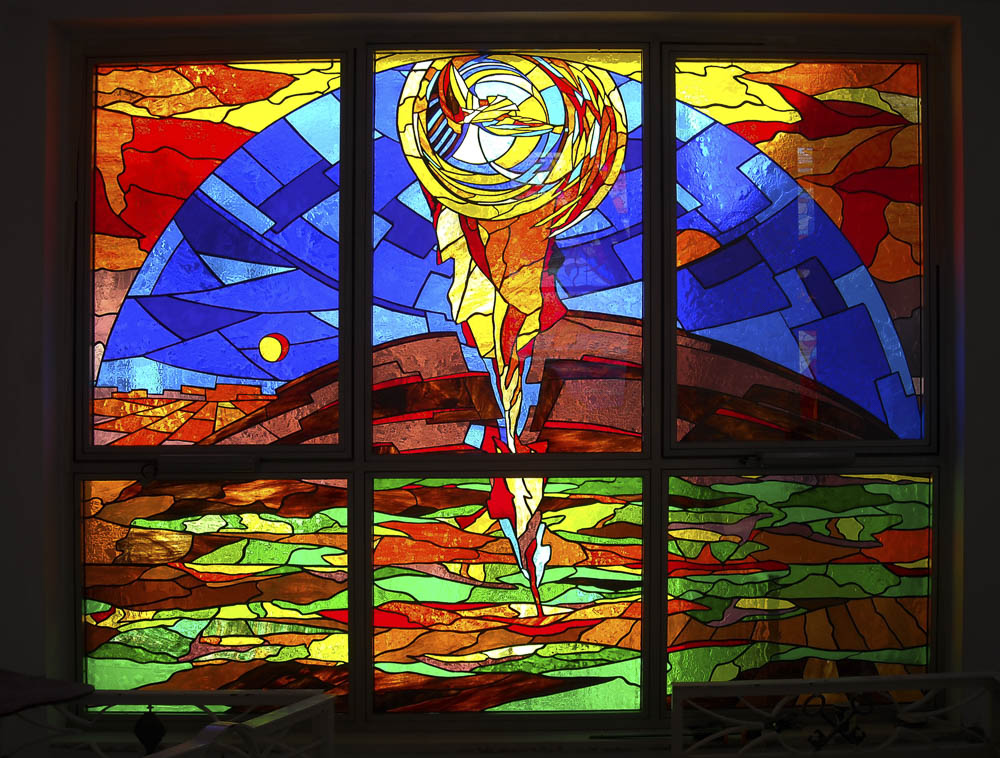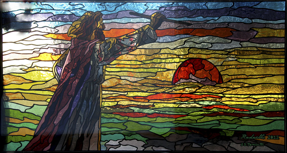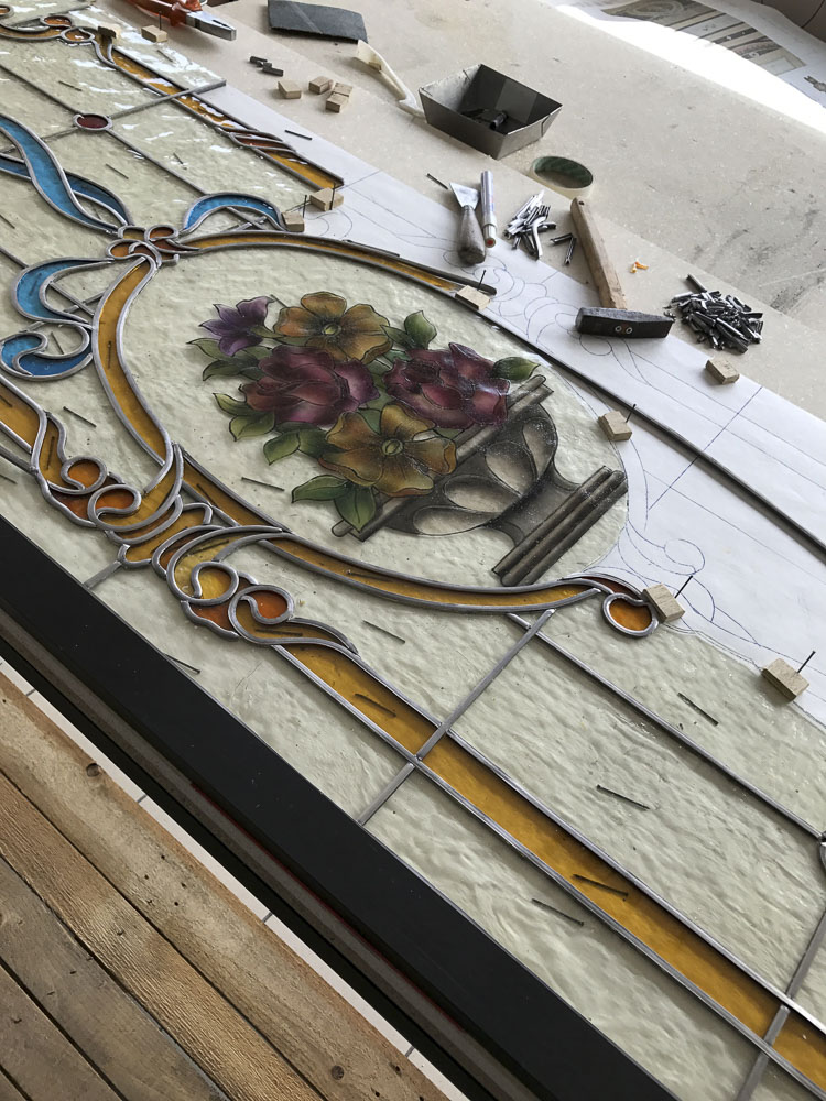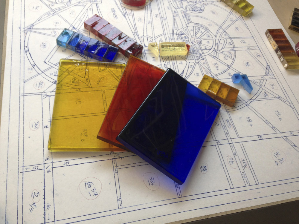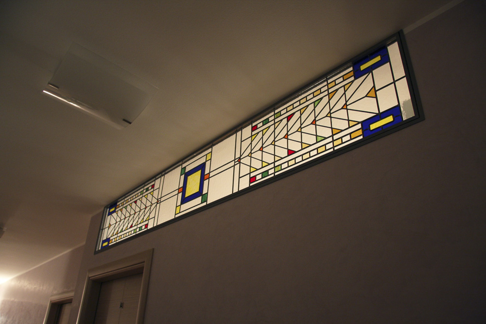 Si comincia dal bozzetto dell’artista, si predispone l’ingrandimento in scala reale, si esegue la scelta cromatica e si tagliano i vetri, quindi si tesse, inserendo i vetri, l’impiombatura. Una volta saldati tutti i piombi ed i vetri tra loro, si passa alla stuccatura. Lo stucco, riempie gli interstizi tra il vetro ed il piombo, impedendo al vetro di muoversi, conferendo rigidità e solidità, nello stesso tempo rendendo la vetrata impermeabile alle intemperie.