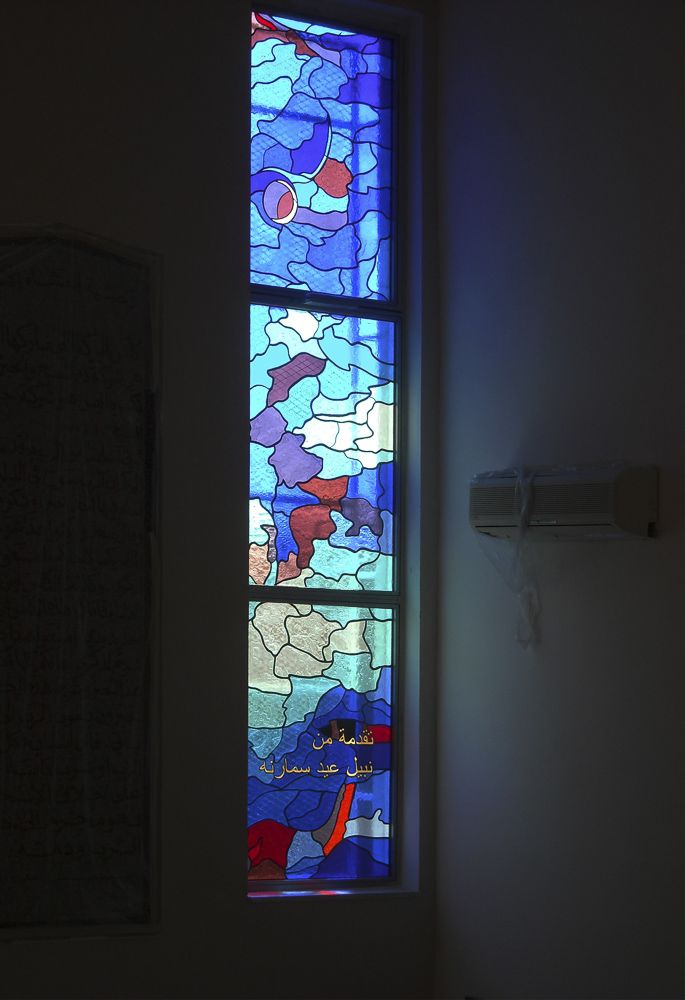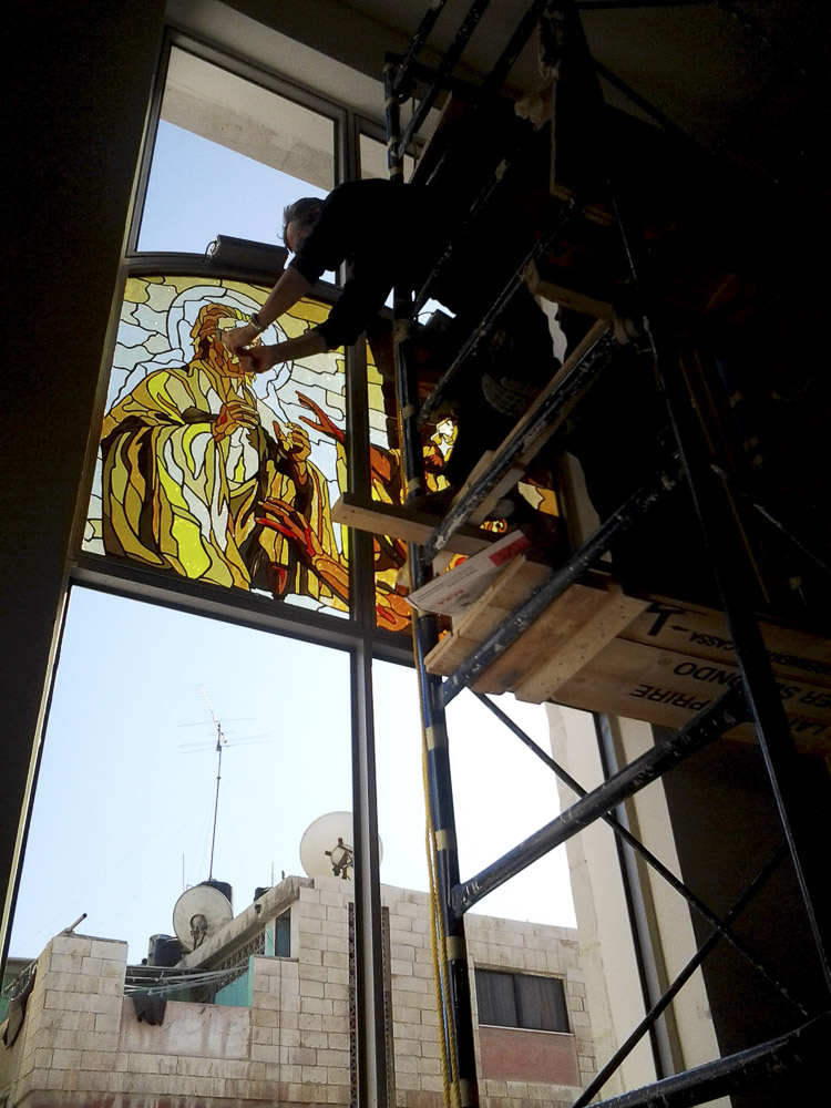 La vetrata viene sottoposta a vibrazioni per permettere al cemento di riempire ogni interstizio.