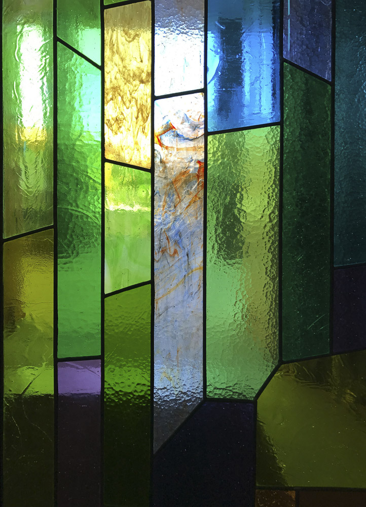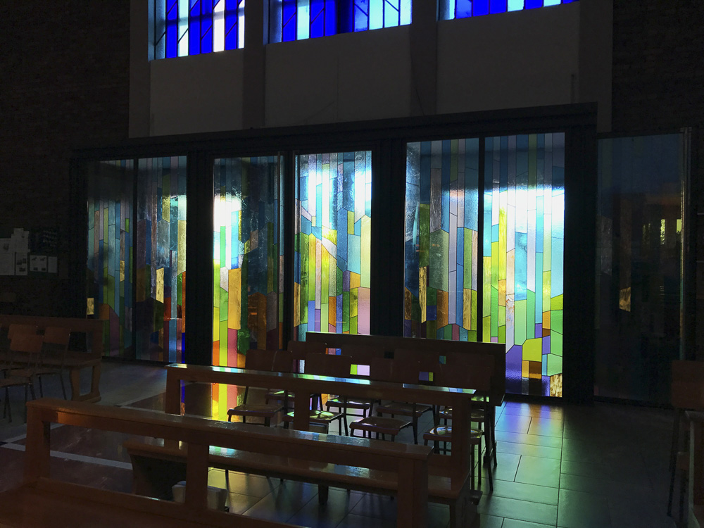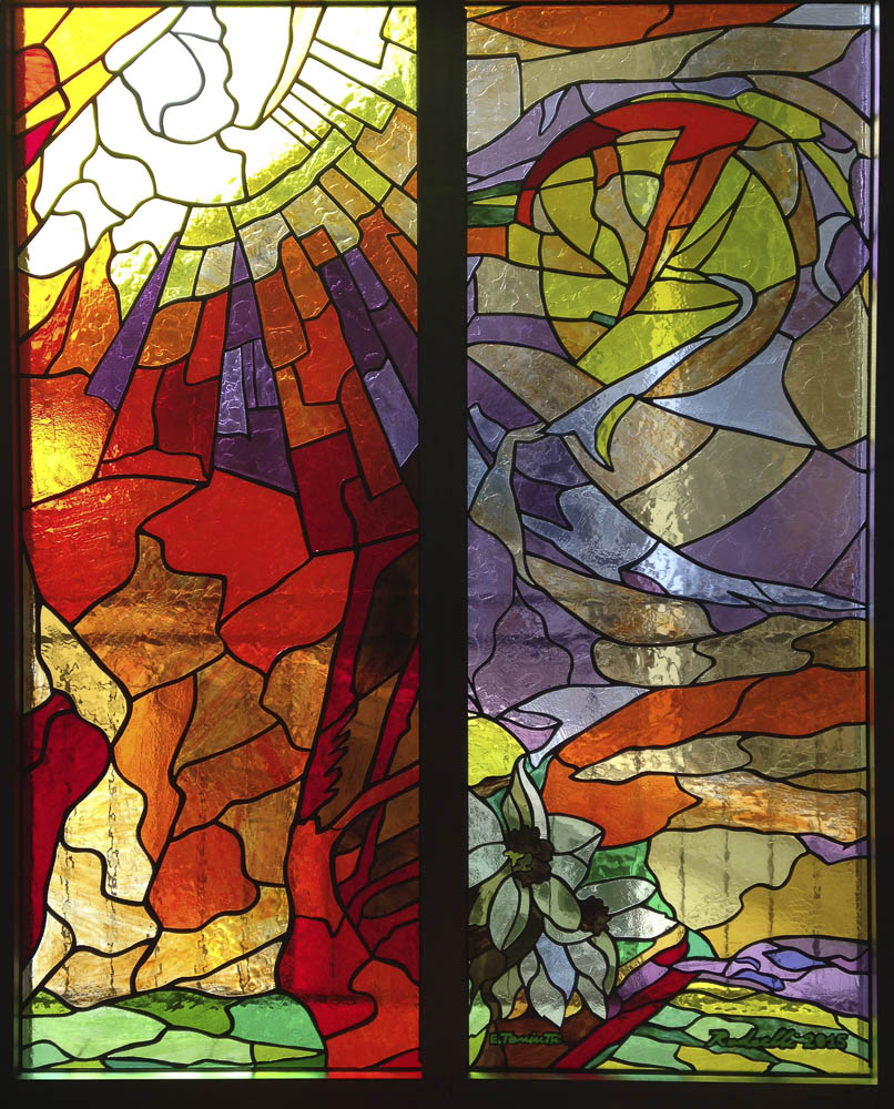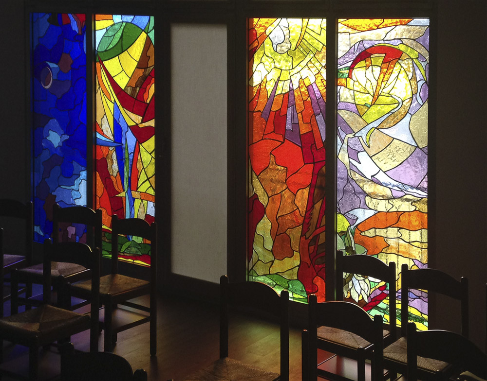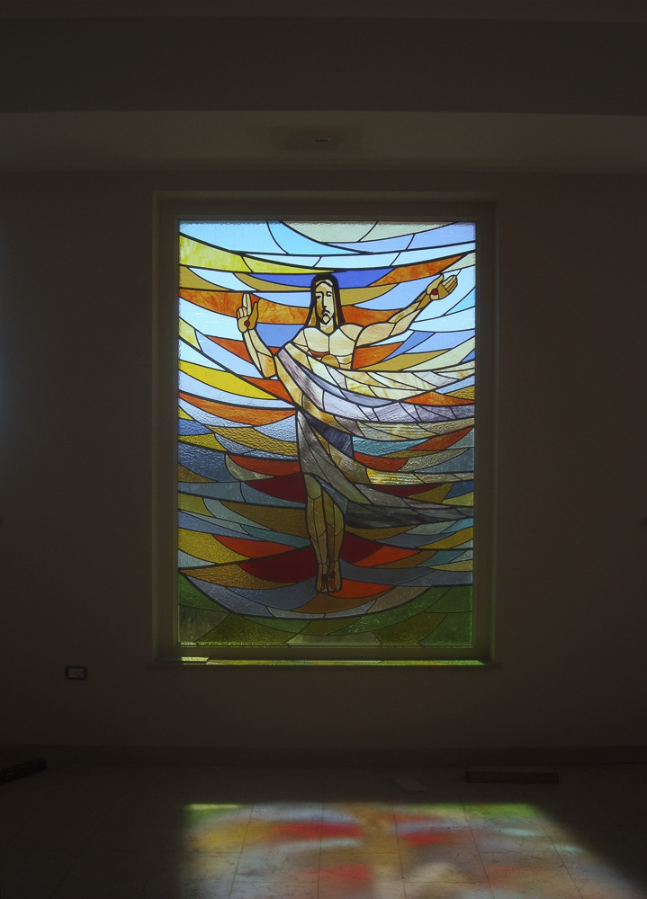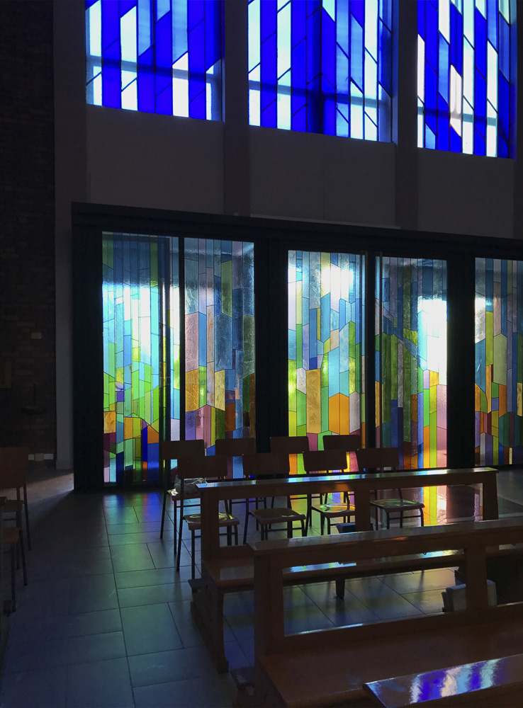 Nella vetrata a Dalles, la luce filtra attraverso i vetri ed il cemento diventa parte integrante della vetrata esaltando ulteriormente la pienezza e luminosità delle Dalles.