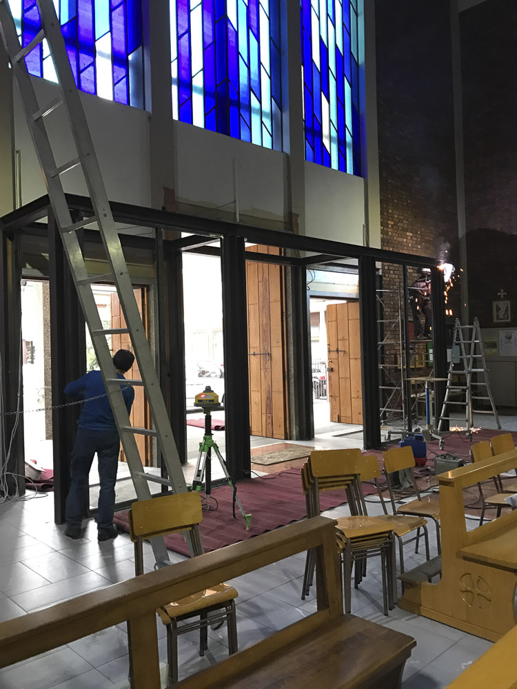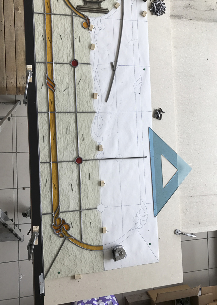 Nel frattempo viene creata una intelaiatura con un tondino in acciaio, seguendo le fughe della vetrata, il tutto viene saldato ad un telaio perimetrale in acciaio o acciaio inox, in modo da ottenere la struttura portante della vetrata.